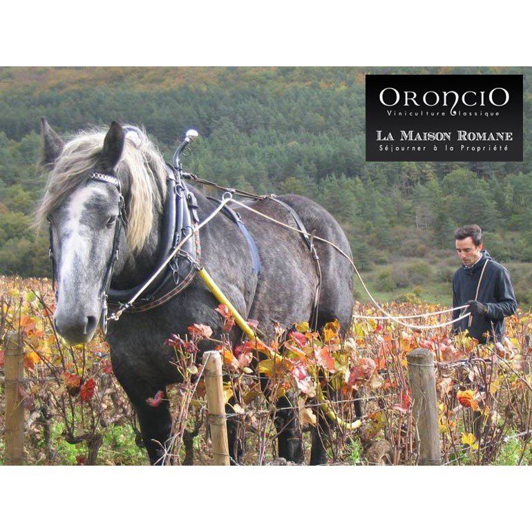 愛馬プロスペールと共に馬を使った畑の耕作を行うオロンス・ド・ベレール氏。耕作請負人として様々な生産者と仕事をしながら葡萄を譲り受け、ネゴシアンとしてワインを造っています。